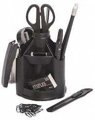 Настольный набор из 13 предметов: шариковая ручка – 1 шт., карандаш с ластиком – 2 шт., ножницы, нож, линейка, точилка, степлер № 10, скобы № 10 – 500 шт., скрепки, кнопки-гвоздики, ластик, подставка.