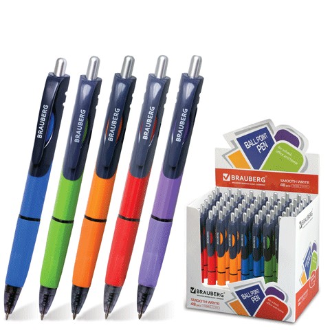 Автоматическая шариковая ручка с резиновым упором для удобства письма. Цвет корпуса - ассорти (5 цветов). Cменный стержень синего цвета. Упакована в фирменную коробку-дисплей оригинального дизайна.