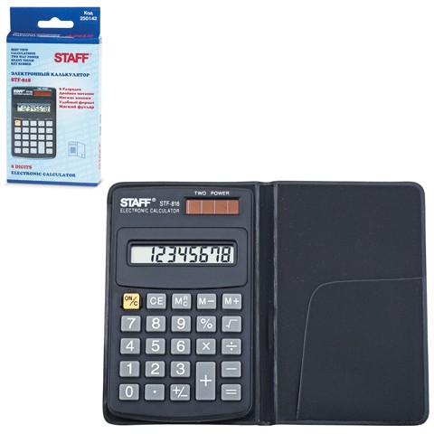 Калькулятор производит все основные арифметические действия, вычисления с памятью, вычисления с процентами, извлечение квадратного корня и возведение в степень. Встроенный аккумулятор и солнечная батарея, образующие единую схему питания калькулятора, позволяют устройству работать при любом освещении. Практичный чехол из ПВХ защищает калькулятор от грязи и случайного включения. Имеет компактные размеры - 102×62 мм.