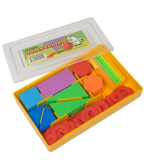 | Параметры | В состав кассы входят: геометрические фигуры, цифры, математические знаки, счетные палочки. | |
