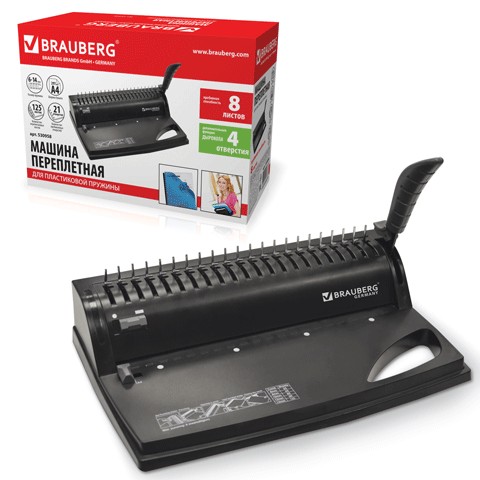 Переплетная машина для пластиковой пружины BRAUBERG 530958 идеально подходит для дома и небольшого офиса, где периодически возникает потребность в переплете документов. С ее помощью можно перфорировать 8 листов плотностью 80 г/м2 и подшивать 125 листов формата А4. При этом она компактная, легкая и удобная в хранении.