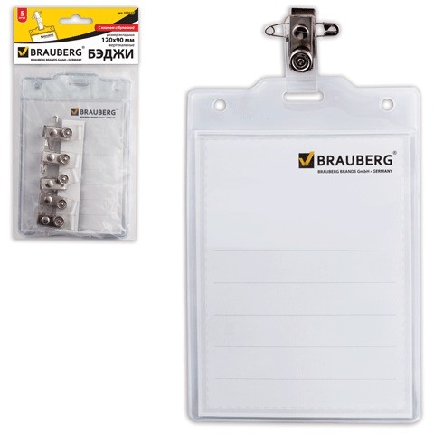 Бейджи BRAUBERG с клипом и булавкой для именных карточек. Карман из мягкого прочного пластика гарантирует долгий срок службы. Клип и булавка обеспечивают удобное и надежное крепление бейджа на одежде.