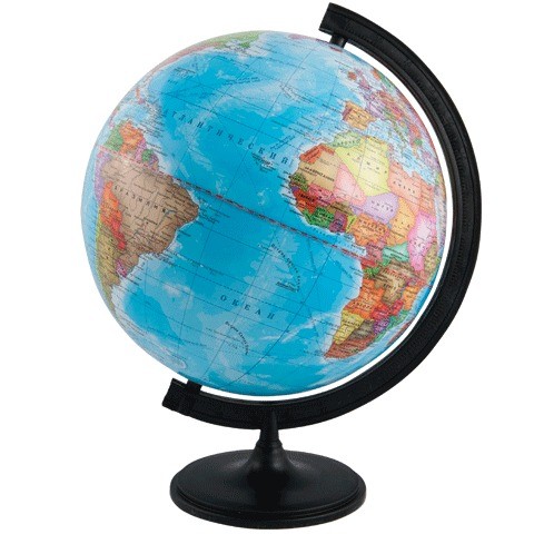 Глобус с политической картой Земли. Покрытие - офсетный лак. Может использоваться как учебное пособие.