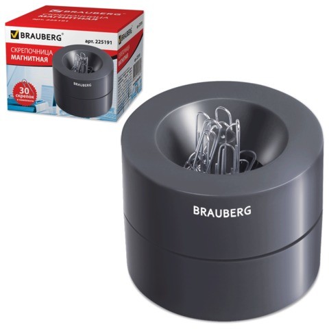 Пластиковая скрепочница в форме бочонка с магнитом для удобной фиксации и хранения скрепок.