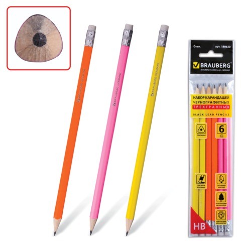 Чернографитные карандаши изготовлены из высококачественной древесины, которая сохраняет грифель от поломки и гарантирует легкую заточку. Корпус обладает трехгранной формой и оснащен стирательной резинкой.