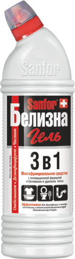 Sanfor "Белизна 3 в 1" — специальное густое средство с инновационной формулой отбеливания и удаления пятен. Благодаря комплексному действию незаменимо при стирке, а также для дезинфекции и чистки сантехники и труб.