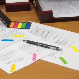 Набор пластиковых закладок 5 неоновых цветов размером 42х12 мм состоит из 100 листов, по 20 закладок каждого цвета. Клейкий слой — 22 Н/