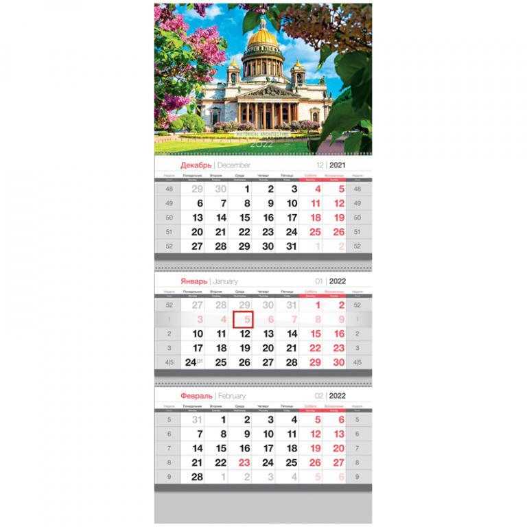 Календарь квартальный на 2022 год, 3 блока на 3-х гребнях. Размер календаря – 295×660 мм.