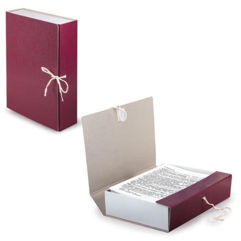 Изготовлен из переплетного картона толщиной 1,5 мм с покрытием бумвинил. Вмещает до 700 листов. Выдерживает до 4 кг. Размер короба - 33x8x24 см. Имеет откидную крышку и 2 хлопчатобумажные завязки. Поставляется в разобранном виде.