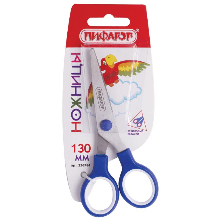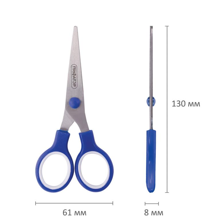 Длина ножниц составляет 130 мм. Они имеют симметричные ручки, выполненные из пластика с резиновыми вставками, которые препятствуют скольжению пальцев во время резки. Лезвия изготовлены из нержавеющей стали. Закругленные концы обеспечивают безопасность при использовании. Поставляются в нескольких вариантах цвета без возможности выбора в картонной упаковке с европодвесом.