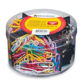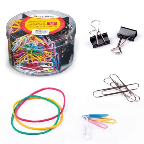 Набор BRAUBERG зажимы 19мм, скрепки 28мм и 50мм резинки для денег в пласт. цилиндре