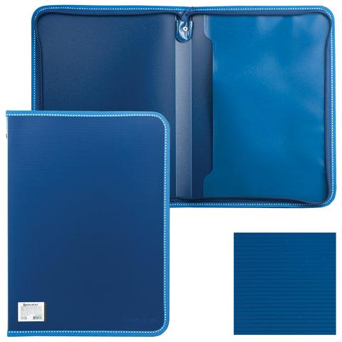 Изготовлена из прочного пластика толщиной 0,5 мм с горизонтальной фактурой. Формат А4 (335х242 мм). Надежный замок-молния защищает документы от механических повреждений, а также пыли и влаги. Цвет папки — синий с голубой молнией.