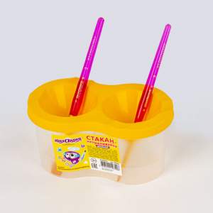 Имеет 2 вместительных резервуара для воды. Специальная форма крышки стакана исключает возможность вытекания воды. Линия на прозрачном корпусе указывает на максимально возможный уровень наполнения. Выполнен из прочного пластика. Имеются специальные углубления на крышке для размещения кисточек. Полный объем — 150 мл. Объем до уровня — 50 мл.