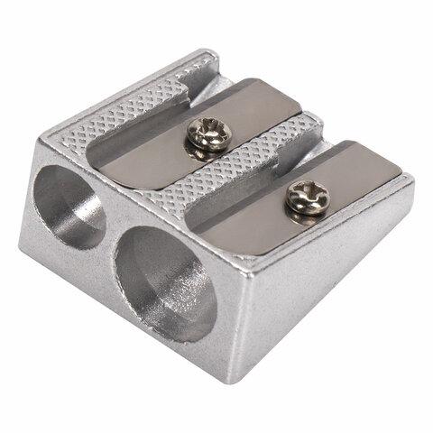 Эргономичный корпус прямоугольной формы выполнен из металла. Точилка оснащена двумя отверстиями для заточки карандашей разного диаметра. Ребристая поверхность корпуса позволяет удобно держать точилку в руке. Острое стальное лезвие обеспечивает быструю и легкую заточку. Размер — 13х25х25 мм.