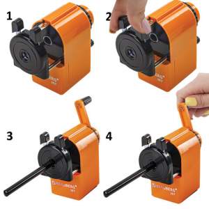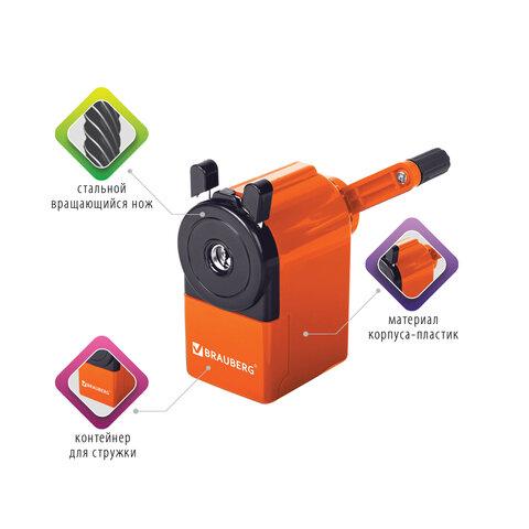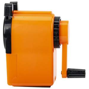 Корпус точилки выполнен из пластика оранжевого цвета. Вращающийся роликовый нож из высококачественной стали обеспечивает быструю и острую заточку. Точилка имеет одно отверстие и вместительный контейнер для сбора стружки. Диаметр затачиваемого карандаша — 8 мм. Размер: 95х45х90 мм.
