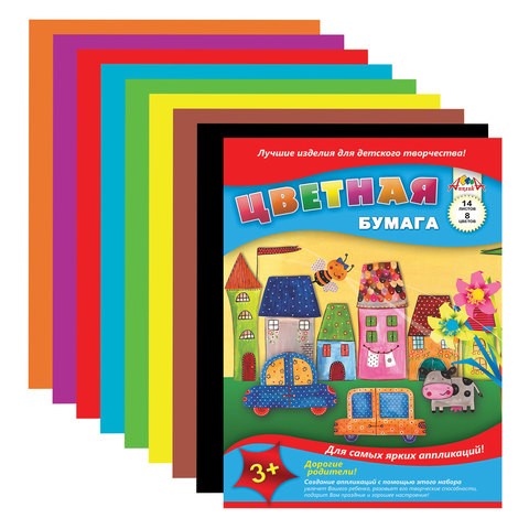 Набор цветной бумаги для детского творчества. Цвета: красный, желтый, оранжевый, зеленый, синий, фиолетовый, коричневый, черный.