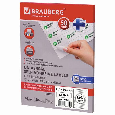 Этикетка самокл. BRAUBERG на листе А4, 64 этикеток 48,3х16,9 мм бел. 127520