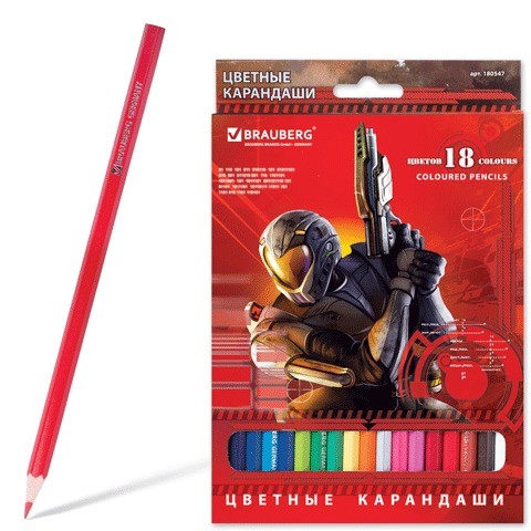 В наборе 18 карандашей, изготовленных из древесины ценных пород. Благодаря высококачественному грифелю, рисунок ляжет на бумагу густо, сплошной четкой линией. Приключения солдата будущего, изображенные на коробке, не оставят равнодушными юных художников.