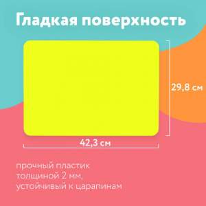 Производится из жесткого прочного пластика толщиной 2 мм, к которому не липнет пластилин. Гладкая фактура материала устойчива к царапинам. Размер -298х423 мм (А3).