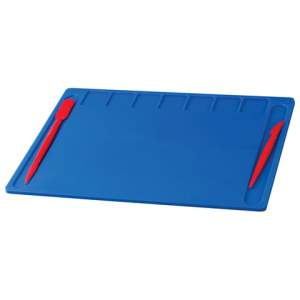 Набор состоит из 3 предметов: 2 стеков и доски. Имеет удобную, функциональную форму с углублениями для стеков и 7 отделениями для пластилина. Производится из жесткого прочного пластика толщиной 2 мм, к которому не липнет пластилин. Размер — 200х280 мм. Выполнена в ярко-синем цвете. Поставляется в термоусадочной пленке.