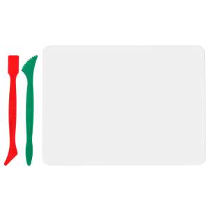 Набор состоит из 3 предметов: 2 стеков и доски. Производится из жесткого прочного пластика толщиной 2 мм, к которому не липнет пластилин. Гладкая фактура материала устойчива к царапинам. Размер - 150×205 мм (формат А5).