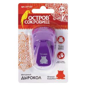 Дырокол компактный и удобный в применении, размер - 6×8,5×13,6 см. Диаметр пробиваемого отверстия - 16 мм, форма вырубки - сова. Режущие части, изготовленные из высококачественного металла, защищены пластмассовым корпусом, что делает дырокол ОСТРОВ СОКРОВИЩ безопасным для детей. Дыроколом можно работать по бумаге, картону и пористой резине плотностью от 80 до 200 г/м2.