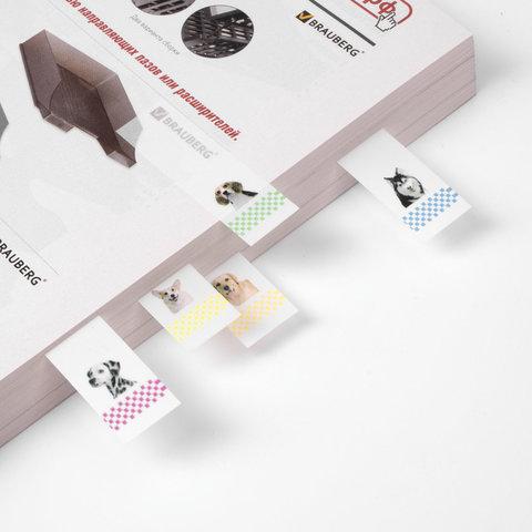 Набор белых пластиковых закладок размером 48х15 мм с 5 разноцветными изображениями щенков по краям состоит из 100 листов, по 20 закладок каждого цвета. Клейкий слой — 22 Н/