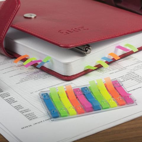 Набор пластиковых закладок-выделителей 5 неоновых цветов размером 48х6 мм состоит из 200 листов, по 40 закладок каждого цвета. Клейкий слой — 22 Н/