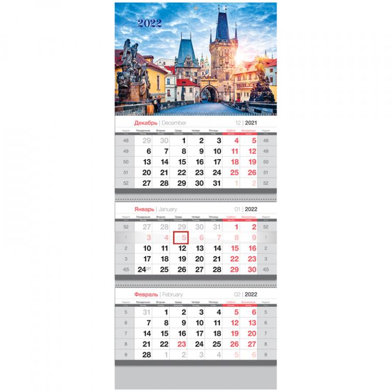 Календарь квартальный на 2022 год, 3 блока на 3-х гребнях. Размер календаря – 295×660 мм.