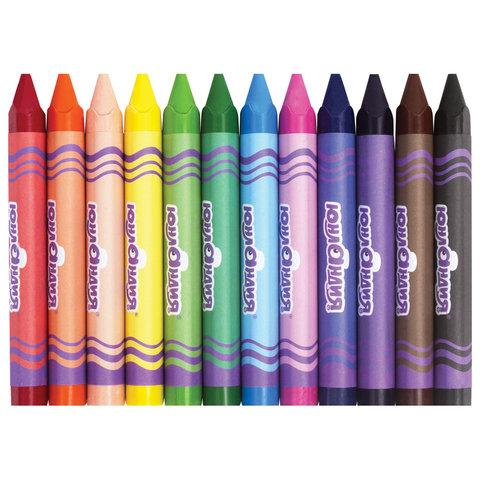 Палитра состоит из 12 ярких и насыщенных цветов. Полностью безопасны в использовании, не токсичны и не имеют резкого запаха. Благодаря своему составу мелки пишут мягко, и ребенку не придется прикладывать усилия в процессе рисования. Утолщенная трехгранная форма корпуса и диаметр 11 мм делают их еще более удобными для тренировки руки к письму у дошкольников и детей младшего школьного возраста, формируют навык правильного захвата, снижают нагрузку на кисти рук. Каждый мелок завернут в бумажную этикетку, что предохраняет от загрязнений, снижает скольжение, увеличивает прочность. Восковые мелки упакованы в картонную коробку с европодвесом.