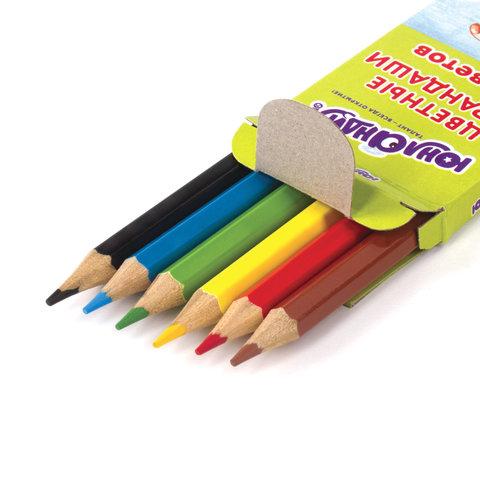 Набор состоит из 6 цветов: красный, желтый, зеленый, голубой, коричневый, черный. Яркие цвета развивают цветовосприятие ребенка. Шестигранная форма сечения корпуса позволяет не скатываться карандашу с поверхности стола во время занятий рисованием. Они изготовлены из древесины ценных пород и имеют лакированный корпус. Высокосортная древесина и качество исполнения гарантируют легкую заточку. Мягкий грифель качества «А» с диаметром 3 мм обладает повышенной прочностью, не ломается и не крошится при заточке. Все карандаши заточены и поставляются в картонной упаковке с европодвесом.