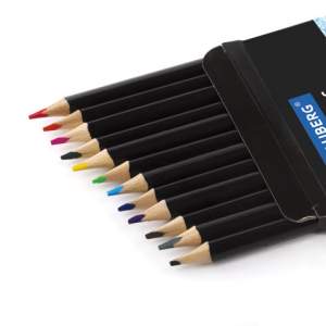 Набор состоит из 12 цветов: розовый, красный, желтый, оранжевый, салатовый, зеленый, голубой, синий, фиолетовый, коричневый, серый, черный. Удобный трехгранный корпус удобен для захвата и снижает напряжение кисти при рисовании. Также трехгранная форма позволяет не скатываться карандашу с поверхности стола во время занятий рисованием. Карандаши изготовлены из древесины ценных пород и имеют черный лакированный корпус. Высокосортная древесина и качество исполнения гарантируют легкую заточку. Благодаря высококачественному грифелю диаметром 3 мм рисунок ляжет на бумагу густо, сплошной четкой линией. Все карандаши заточены и поставляются в картонной упаковке с европодвесом.