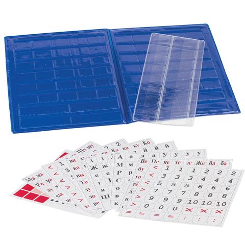 Касса содержит 8 бумажных карточек формата А5 с напечатанными на них буквами, цифрами, математическими знаками, которые предварительно нужно вырезать для дальнейшего использования. Вырезанные элементы удобно размещаются и хранятся в папке из ПВХ со специальными прорезями и прозрачными карманами. Максимальная высота символа - 23 мм. Предназначен для детей старше 3-х лет.