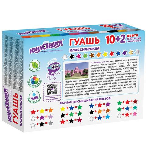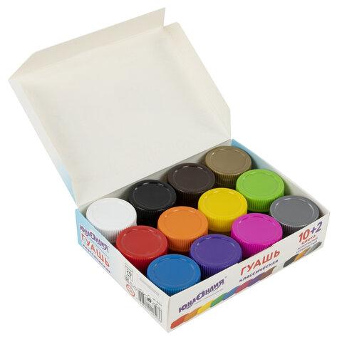 В наборе 12 ярких сочных цветов, которые включают два уникальных цвета — золотой и серебряный. Краски полностью безопасны в использовании, не токсичны и не имеют резкого запаха. Гуашь имеет высокую светостойкость и укрывистость, легко размывается водой, хорошо наносится, без труда удаляется с рук и одежды. Краска упакована в пластмассовые герметичные баночки, объемом 20 мл. Общий объем гуаши — 120 мл. Ребенок сможет легко открыть баночки с винтовыми крышками без помощи взрослых.
