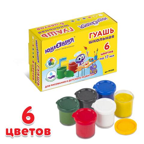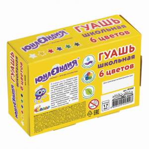 6 ярких сочных цветов красок полностью безопасны в использовании, не токсичны и не имеют резкого запаха. Гуашь имеет высокую светостойкость и укрывистость, легко размывается водой, хорошо наносится, без труда удаляется с рук и одежды. Краска находится в пластмассовой герметичной баночке, объем которой равен 17 мл. Общий объем — 102 мл.