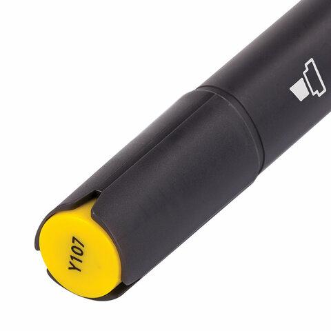 Двусторонний маркер для скетчинга с треугольной формой корпуса из пластика, диаметр которого 15 мм. Форма наконечника — тонкий и скошенный. Цвет — ярко-жёлтый. Толщина линии письма — 1-6 мм в зависимости от наконечника. Особая основа маркера обеспечивает такие качества, как стойкость к воздействию воды, ультрафиолету, низких и высоких температур. Благодаря спиртовой основе чернила быстро сохнут и не размазываются. Износостойкий фетровый наконечник устойчив к повреждениям и обеспечивает экономный расход чернил. Изделие не перезаправляется. Плотно закрывается колпачком, что предотвращает высыхание наконечника и чернил. Цвет колпачка соответствует цвету чернил.