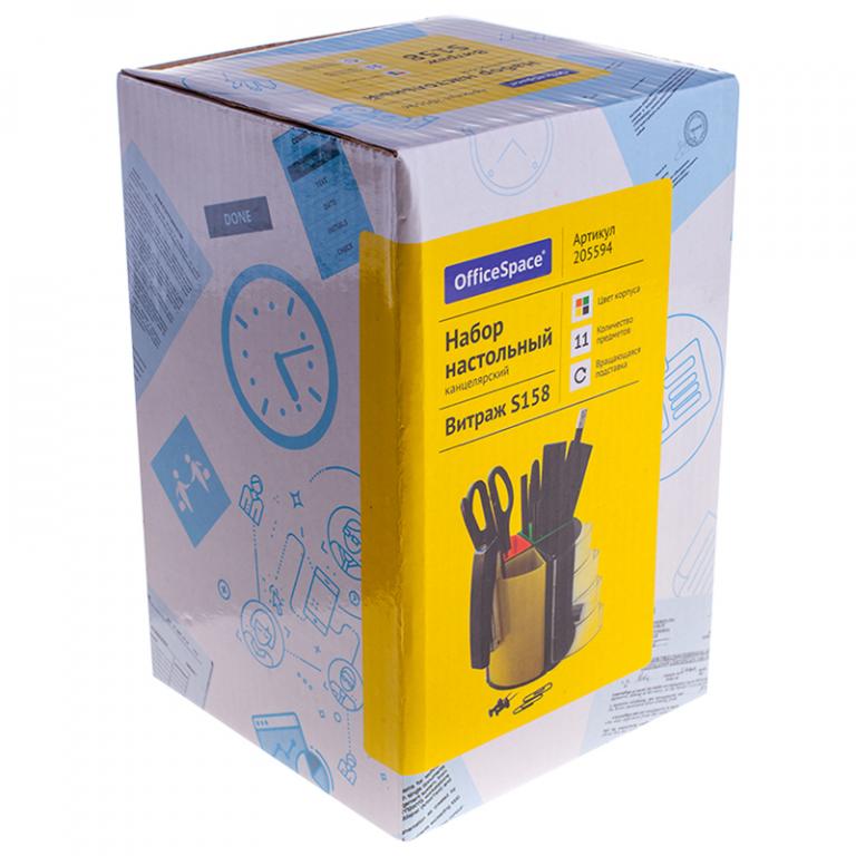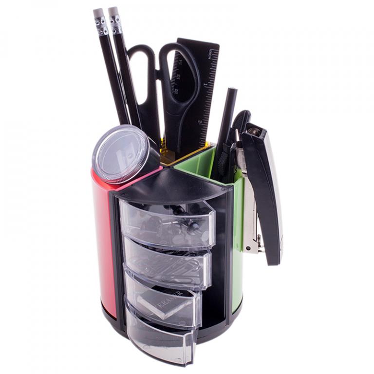 Настольная подставка OfficeSpace «Витраж» с 7 отделениями обладает функциональной и стильной конструкцией, которая подходит для хранения канцелярских мелочей. Прочный чёрный корпус выполнен из высококачественного пластика. Подставка может вращать органайзер на 360 градусов. В состав OfficeSpace «Витраж» входят 11 предметов для комфортной работы в офисе: 2 карандаша, линейка, кнопки, шариковая ручка, степлер, ножницы, канцелярский нож, скрепки, ластик, скобы для степлера, точилка.Материал: пластик; Цвет: чёрный;Количество предметов: 11. Количество секций: 7; Размер: 10*10*11 см