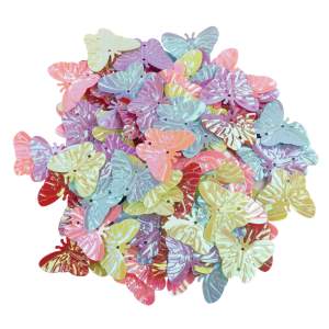 Изготовлены из высококачественного пластика. В наборе представлены 5 оттенков. Пайетки имеют форму бабочек. Оснащены отверстиями для нити в центре. Предназначены для детей от 3 лет. Диаметр - 15 мм. Вес - 20 г. Поставляются в пакете с европодвесом.