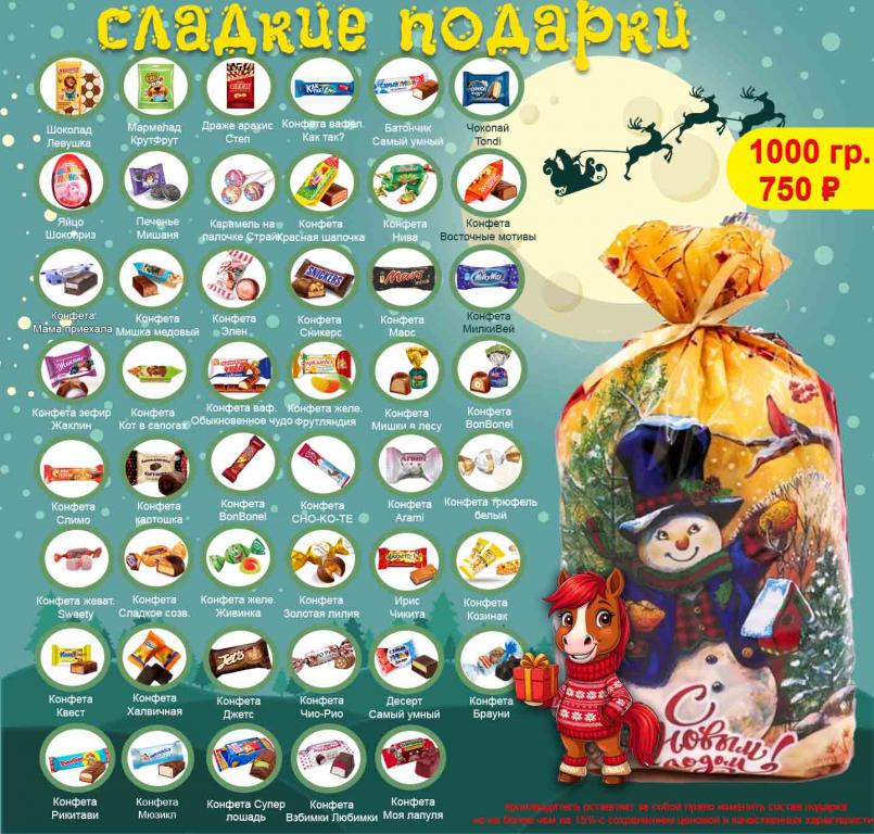 Производитель оставляет за собой право изменить состав подарка на 15% не более, при этом качественные и стоимостные характеристики не поменяются, то есть заменить какую либо конфету на равную ей по цене и по вкусовым характеристикам.