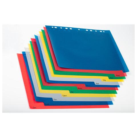 Изготовлены из пластика толщиной 0,12 мм. В комплект входят 12 листов синего, красного, серого, зеленого и желтого цвета, обеспечивающих возможность сортировки документов по месяцам, а также титульный лист для оглавления. Универсальная перфорация позволяет подшивать разделители во все типы папок. Размер — 246х305 мм.