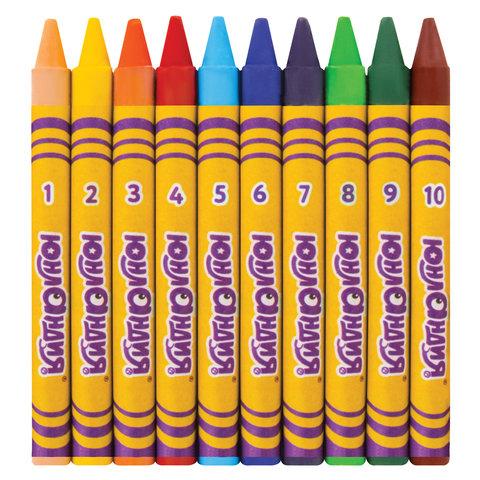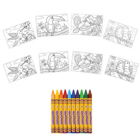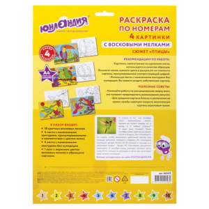 В набор входят: 10 цветных восковых мелков, 4 листа для тренировки, 4 разные картонные основы с нанесенным контуром формата А4 (210х297 мм).