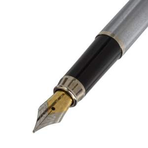 Стильная модель перьевой ручки с корпусом из металла серебристого цвета и хромированными деталями. Синий цвет чернил, иридиевое перо украшено гравировкой. Диаметр пишущего узла 0,5 мм создает ровню линию письма. Тип пера M (Medium) — средняя ширина линии. Поставляется в фирменной упаковке.