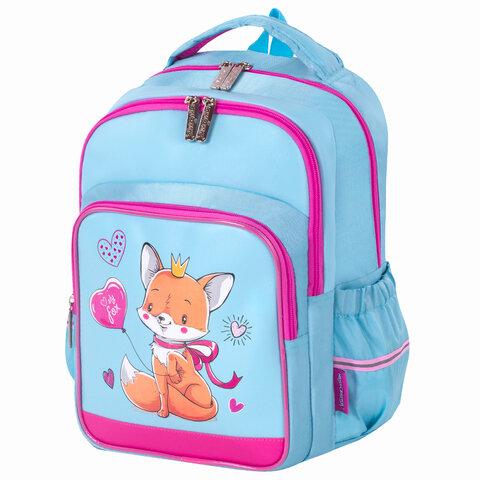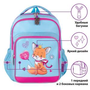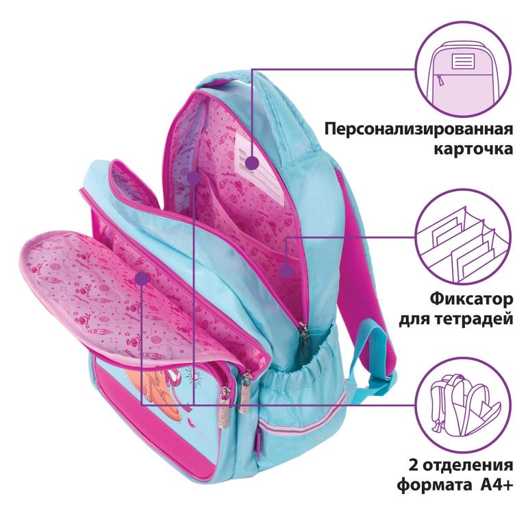 Рюкзак выполнен из высококачественной влагоотталкивающей нейлоновой ткани с приятной шелковистой поверхностью, ткань легко чистится. Модель имеет 2 вместительных отделения на молнии и 3 кармана: большой передний, из искусственной кожи, с яркой печатью, и два боковых кармана на резинке, в которых можно переносить бутылочку, термос или зонт. Оптимальный размер рюкзака позволяет вместить все необходимые школьные принадлежности. Именная карточка внутри основного отделения поможет обеспечить сохранность рюкзака.