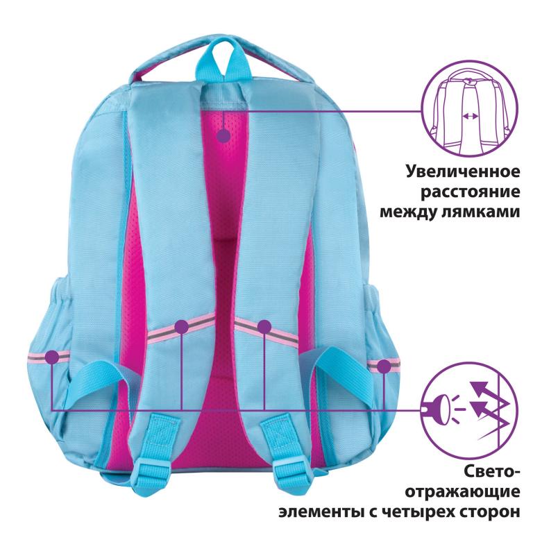 Удобная мягкая вентилируемая спинка с воздушными спонжевыми панелями разработана с учетом анатомических особенностей детей младшего школьного возраста. При правильной регулировке рюкзак будет практически не ощущаться на плечах и не будет доставлять дискомфорт при носке. В процессе эксплуатации равномерное распределение нагрузки позволит сохранить правильную осанку!