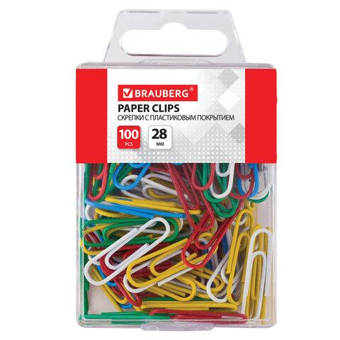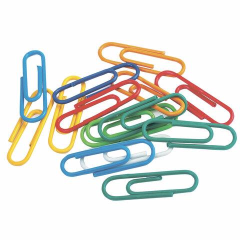 Скрепки изготовлены из стали, имеют классическую овальную форму и цветное пластиковое покрытие. Длина скрепки составляет 28 мм. Не окисляются и не повреждают документы. 100 штук в пластиковой коробке.