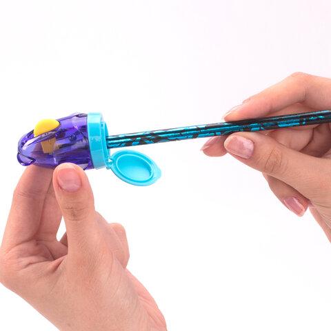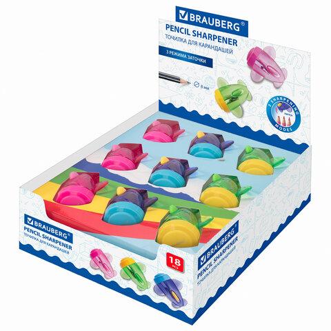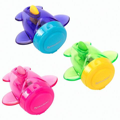 Эргономичный корпус в форме самолета выполнен из пластика ярких цветов ассорти. Острое стальное лезвие обеспечивает быструю и легкую заточку. Точилка оснащена переключателем режимов заточки, один для чернографитных, другой для цветных карандашей. Карандаши затачиваются аккуратно, а опилки остаются в специальном контейнере. Размер — 34х56х55 мм.