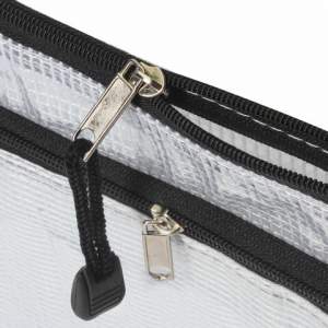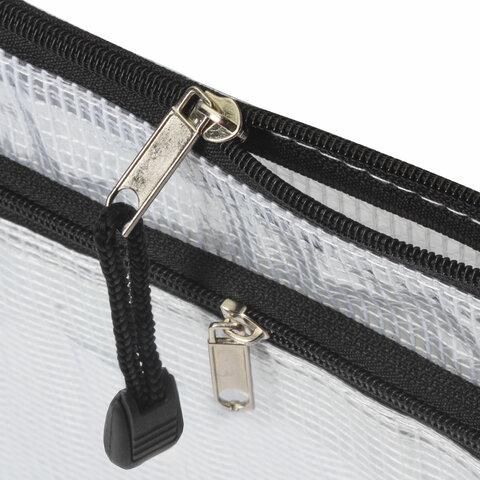 Изготовлена из прочного прозрачного пластика толщиной 0,3 мм с сетчатой фактурой и имеет 2 отделения. Формат А5 (238х180 мм). Герметичная застежка-молния защищает документы от механических повреждений, а также пыли и влаги. Цвет молнии — черный.