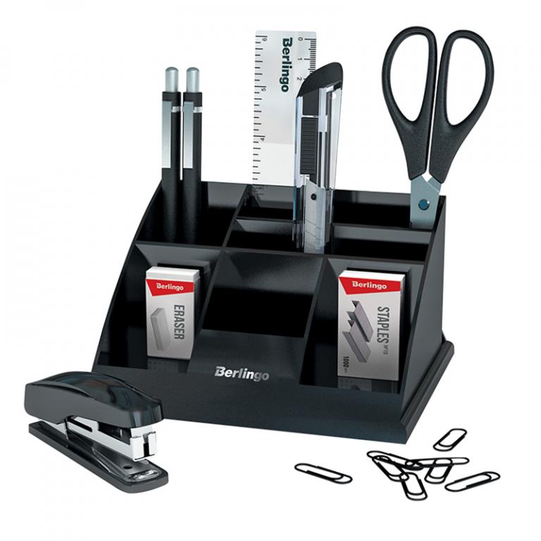 Настольный органайзер Berlingo Western – это лаконичный дизайн и функциональность. Корпус выполнен из высококачественного чёрного пластика. В состав Berlingo Western входят: линейка, офисный нож, шариковая автоматическая ручка, механический карандаш, ластик, ножницы, степлер, скобы, скрепки.