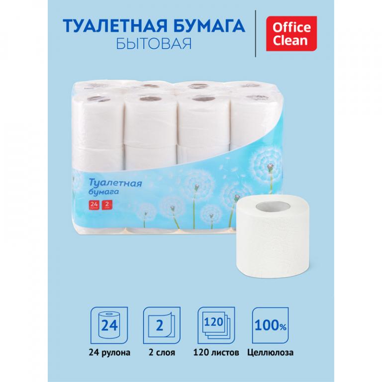 Туалетная бумага двухслойная «OfficeClean» белого цвета, состав сырья: 100% целлюлоза, с перфорацией и тиснением. 24 рулона в неделимой упаковке. Показатели качества и безопасности соответствуют требованиям ГОСТ Р 52354-2005.