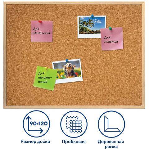 Поверхность изготовлена из натуральной пробки. Имеет деревянную рамку. Размер доски — 90х120 см. Цвет покрытия: коричневый. Возможность горизонтального и вертикального размещения доски. Крепится к стене, элементы крепления входят в комплект. Гарантия 10 лет. Отверстия в пробке «закрываются» сразу же после извлечения кнопки. Таким образом, доска прослужит на протяжении долгих лет, несмотря на частое использование.